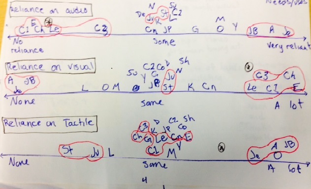 Characteristics lists of all participants were then compared to identify interesting and important distinctions between the people in the sample. Some distinctions that came out of these data were tech savviness, reliance on auditory elements, reliance on visual elements, and reliance on tactile elements. Using the distinctions, scales were created in order to map the real people along a continuum. After each data point was mapped on the continua, patterns began to emerge when the same group of people would fall on the same area of multiple continua (see Figure 1).